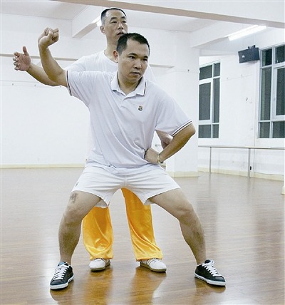 王敏夫(后)指导学生练拳。
